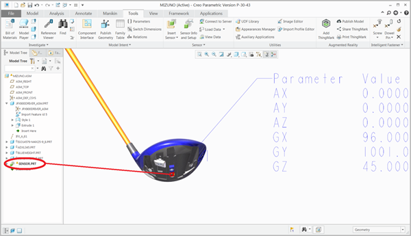 In order to use the data in Creo Parametric, a sensor “part” is added to the Creo model. Then, the parameters of the sensor are associated with the data stream. Here’s how it all looks: