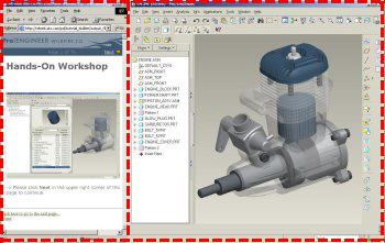 - 依照下圖中所示,將本指南放在 Pro/ENGINEER Wildfire 2.0 視窗的左側。如此一來,您就可以一邊工作,一邊輕鬆地檢視指南視窗。