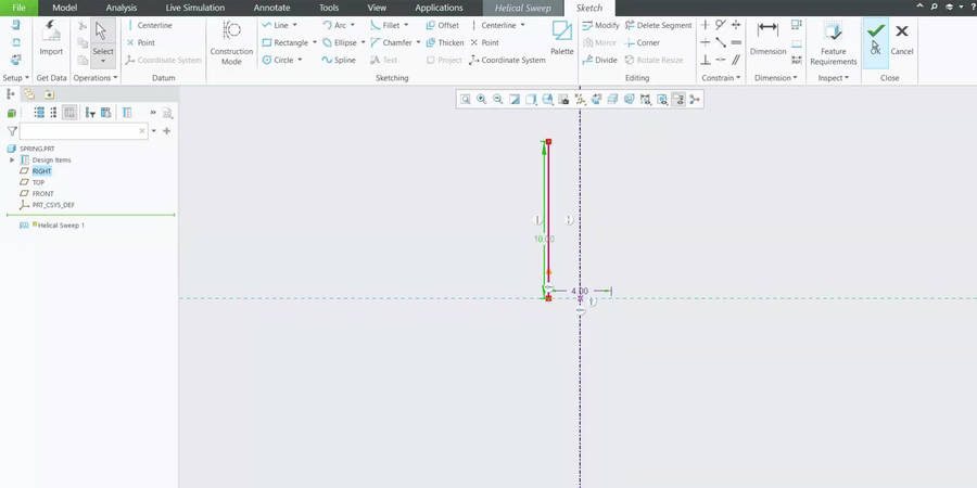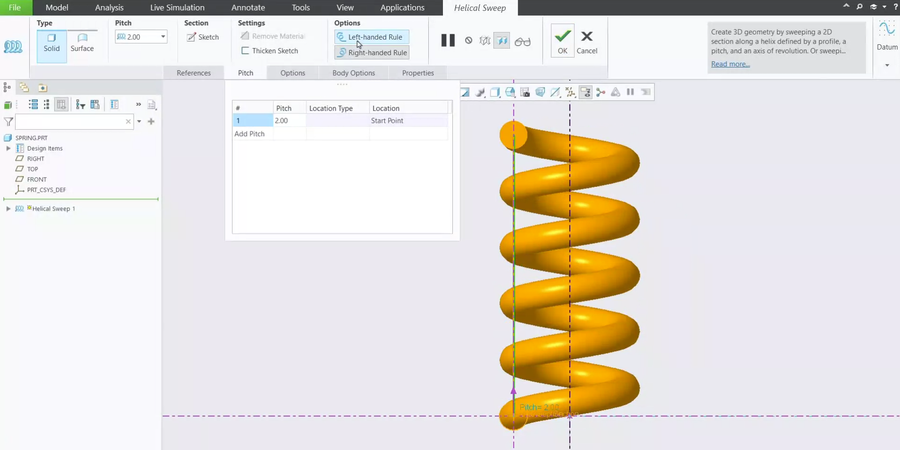 Helix-Sweeps werden für Federn, Gewinde, Spulen oder jede andere helikale Geometrie verwendet. Um einen Helix-Sweep in Creo zu erstellen: