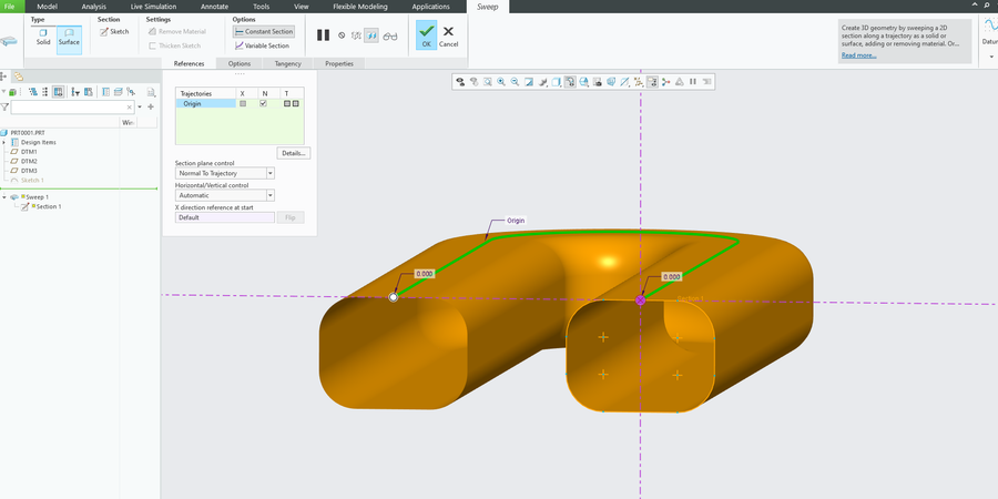 Zusätzlich zu festen Merkmalen können Sweeps verwendet werden, um Oberflächengeometrie zu erstellen. Ein Oberflächen-Sweep bewegt einen Abschnitt entlang einer Trajektorie, ohne ein festes Modell zu erstellen. Oberflächen-Sweeps werden häufig verwendet, um komplexe Oberflächen zu erstellen oder die Entwicklung fortschrittlicher Formen zu unterstützen. In Creo können Sie einfach auswählen, ob ein Merkmal ein fester oder ein Oberflächen-Sweep ist, indem Sie den Typ auf der linken Seite des Modellmenüs auswählen, wenn Sie Ihren Sweep entwerfen.