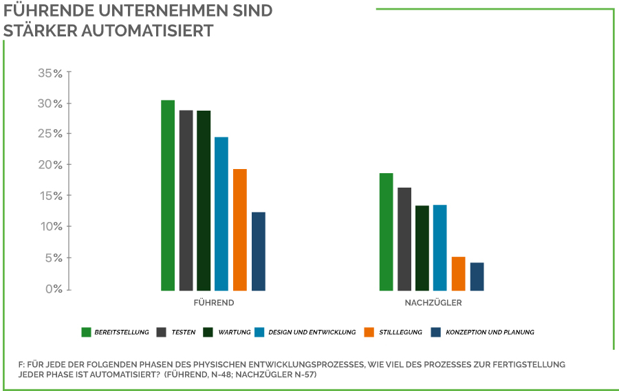 Die Befragten wurden gebeten, den Automatisierungsgrad in mehreren wesentlichen physischen Produkt-Workflow-Prozessen zu bewerten, darunter Bereitstellung, Testen, Wartung, Design und Entwicklung, Ausscheiden sowie Ideenfindung und Planung. Wie der Name schon sagt, dominierten die führenden Unternehmen in jedem Segment, und es war nicht besonders knapp. In den drei am stärksten umkämpften Kategorien Bereitstellung, Testen sowie Ideenfindung und Planung lag der Automatisierungsgrad zwischen führenden Unternehmen und Nachzüglern jeweils um 13% auseinander. Design und Entwicklung waren der größte Bereich, in dem sich die führenden Unternehmen mit durchschnittlich 25% von den Nachzüglern mit 5% unterschieden.