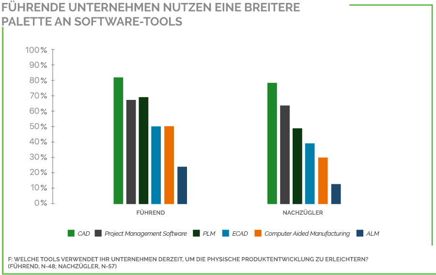 - 69% der führenden Unternehmen gaben an, PLM-Tools zu verwenden, um die physische Produktentwicklung zu erleichtern, gegenüber 49% der Nachzügler.
