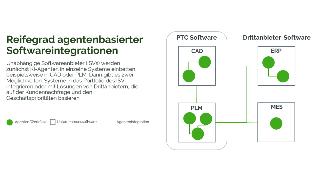 1. Unabhängige Softwareanbieter (ISV): Da KI-Agenten in Unternehmenssoftware immer häufiger eingesetzt werden, werden ISVs Multi-Agenten-Architekturen innerhalb und zwischen Softwaresystemen einführen. Das Reifegradmodell für ISVs beginnt in der Regel mit der Einbettung von KI-Agenten in einzelne Softwaresysteme, wie z. B. die CAD- oder PLM-Lösungen von PTC. Nach dieser Phase gibt es zwei Möglichkeiten. Eine Möglichkeit besteht darin, Agentenintegrationen zwischen Software im Portfolio des ISVs oder Zielintegrationen zwischen Lösungen von Drittanbietern zu erstellen. Es gibt Fälle, in denen Integrationen innerhalb eines Portfolios strategisch sind, wie z. B. die Nutzung bestehender Integrationen zwischen Creo und Windchill zur Unterstützung von Konstrukteuren. Oder die Priorisierung von Windchill PLM-Integrationen mit externen ERP- und MES-Lösungen zur Unterstützung kritischer nachgelagerter Prozesse für Hersteller.