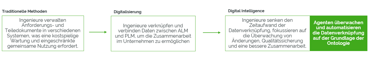 1. Digitale Rückverfolgbarkeit und Kollaboration: Rückverfolgbarkeitsagenten überwachen Änderungen (Automatisieren) an Anforderungen, Entwürfen und Systemmodellen innerhalb von ALM- und PLM-Software, benachrichtigen Ingenieure über Änderungen und empfehlen Aktualisierungen (Unterstützen) . Wenn eine Änderung erforderlich ist, automatisiert der Agent die Verknüpfung neuer oder aktualisierter Objekte auf der Grundlage der Datenontologie (Automatisieren).