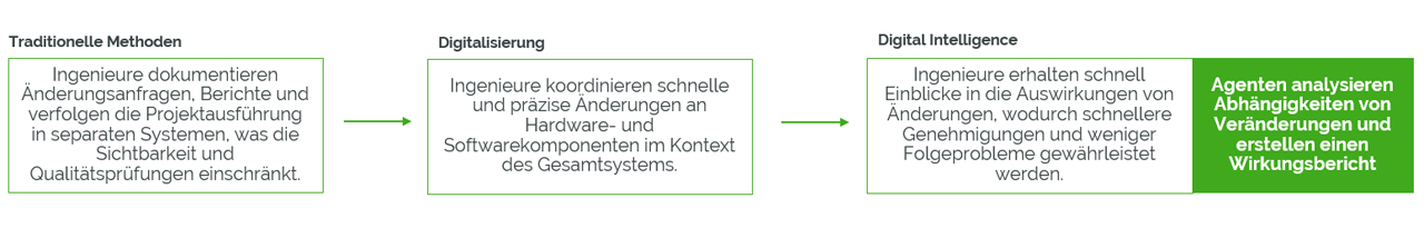 2. Unternehmensweites Change Management: Das Management technischer Änderungen ist komplex, da sich Änderungen in einem System auf andere auswirken. Change-Management-Agenten analysieren Abhängigkeiten (Unterstützen) in den Bereichen Software, Mechanik und Elektrik, prognostizieren die Auswirkungen von Änderungen vor der Implementierung und erstellen einen Bericht über die Auswirkungen (Automatisieren), den die Ingenieure überprüfen können.