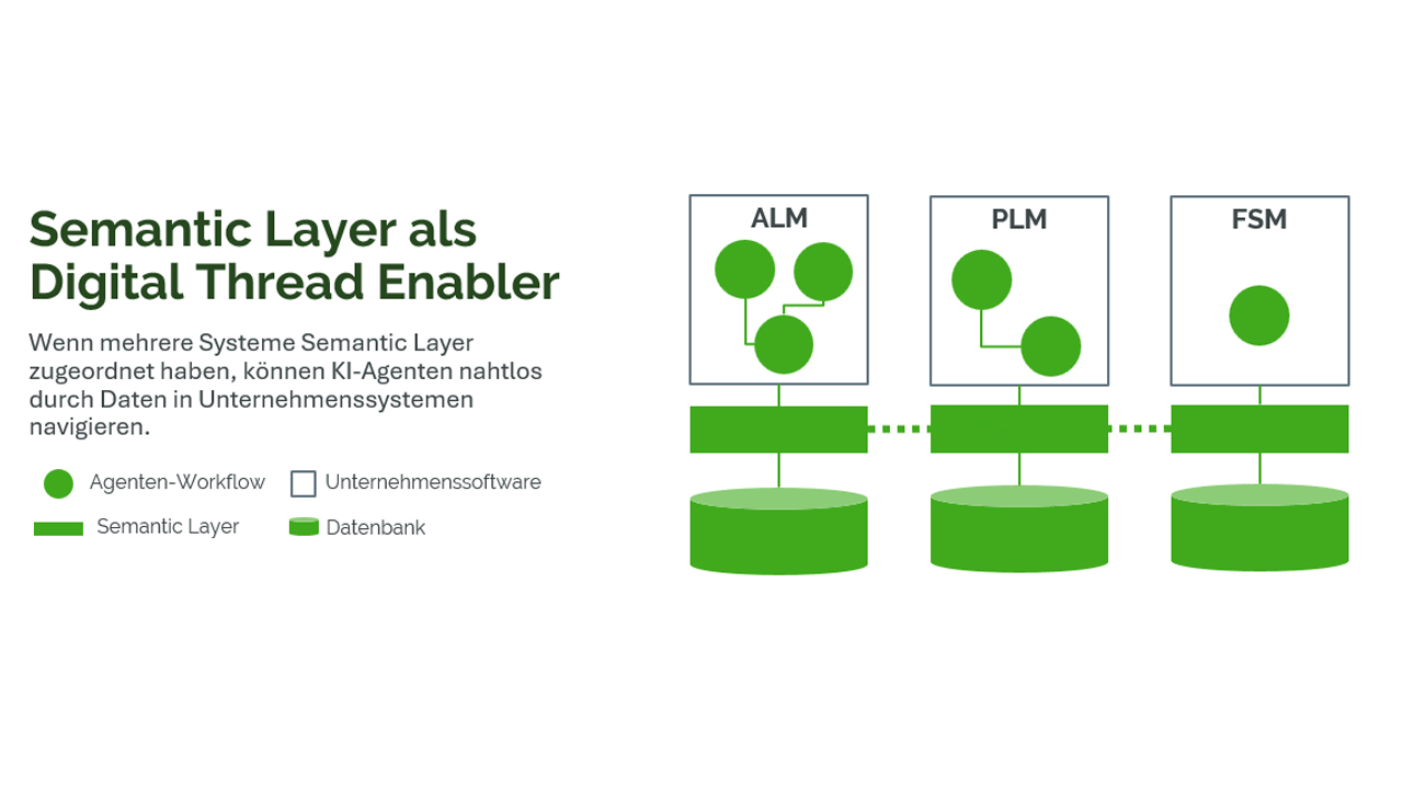 Ein weiterer wichtiger Vorteil eines Semantic Layers ist die verbesserte Softwareintegration. Wenn mehrere Systeme Semantic Layer zugeordnet haben, können KI-Agenten nahtlos durch Daten in Unternehmenssystemen navigieren. Durch die Zuordnung des Semantic Layers zwischen Systemen wie ALM, PLM und FSM werden beispielsweise neue Anwendungsfälle für geschlossene Regelkreise erschlossen, wie z. B. ein Agent in Codebeamer, der Problemberichte von ServiceMax verarbeitet, um eine Anforderungsaktualisierung zu informieren, die wiederum ein Änderungsprojekt in Windchill initiiert.