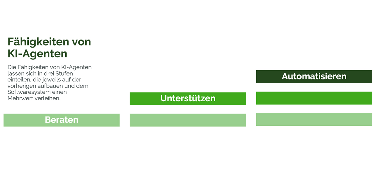 Um diese Welt der Agenten zu verwirklichen, müssen Hersteller einen schrittweisen Ansatz verfolgen, der mit schnellen Erfolgen beginnt und diese dann skaliert. Als Leitfaden für diese KI-Reise empfehlen wir, KI-Agenten auf der Grundlage von drei Schlüsselkompetenzen zu konzipieren: Beraten, Unterstützen und Automatisieren. Jede dieser Kompetenzen baut auf der vorherigen auf und steigert den Wert für den Geschäftsbetrieb.