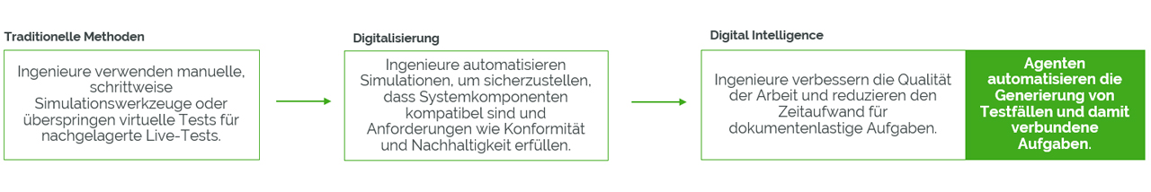 4. Virtuelle Produktvalidierung: KI automatisiert die Erstellung von Testszenarien und Validierungsabläufen (Automatisieren) und beschleunigt so die Erstellung nachgelagerter Ergebnisse, die für Software- und Hardwarekomponenten erforderlich sind, um die Anforderungen an Konformität, Sicherheit und Leistung zu erfüllen, bevor physische Prototypen erstellt werden.