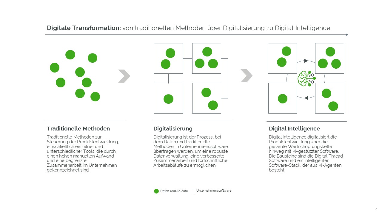 Digital Intelligence digitalisiert die Produktentwicklung über die gesamte Wertschöpfungskette hinweg mit KI-gestützter Software. Die Grundlage dieser Transformation bildet Unternehmenssoftware für die Industrie – wie ALM, PLM, CAD und FSM – in Kombination mit einem intelligenten Software-Stack, der aus KI-Agenten besteht.