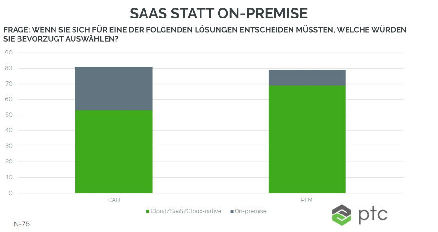 Für diese Hersteller gibt es verschiedene Möglichkeiten. Sie können entweder bestehende Altsysteme aufrüsten (die wahrscheinlich als On-Premises-Lösungen aufgebaut sind) oder auf Cloud-native SaaS-Plattformen umsteigen. Unsere Untersuchungen zeigen, dass letzteres die weitaus beliebtere Option ist, insbesondere für PLM. Auf die Frage, ob sie eine On-Premises- oder eine Cloud-native SaaS-Lösung einsetzen würden, gaben 53 Befragte an, dass sie sich für SaaS-basiertes CAD interessieren (gegenüber 28 für On-Premises), und 69 Befragte äußerten Interesse an einer Cloud-PLM-Lösung (gegenüber nur 10 für On-Premises). Für alle Fertigungsunternehmen, die erwägen, bei einer lokalen Software-Infrastruktur zu bleiben, ist die Botschaft klar: Sie mögen mit einer lokalen Lösung zufrieden sein, aber Sie können nicht davon ausgehen, dass Ihre Konkurrenz das auch ist.