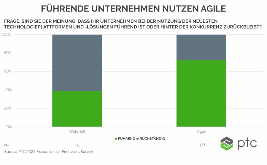 Wir sind uns bewusst, dass Agile für viele Hardware-Hersteller ein massives Umdenken bedeutet, aber wir sind fest davon überzeugt, dass es Ergebnisse bringen wird, und wir haben die Daten, die das belegen. In einer kürzlich von PTC durchgeführten Umfrage waren 72% der Agile-Anwender der Meinung, dass ihr Unternehmen bei der Nutzung der neuesten Technologieplattformen und -Lösungen im Wettbewerb führend ist. Nur 39% der Wasserfall-Anwender konnten das Gleiche behaupten.
