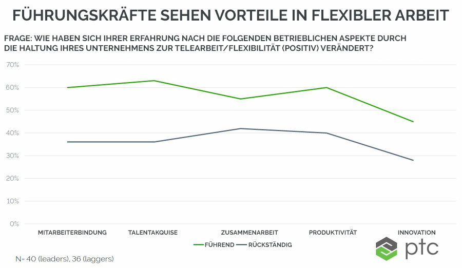 Dies wird viele Formen annehmen, wie z. B. die Verlagerung von Arbeitsabläufen in dezentrale Bereiche, wo dies möglich ist, die Verlagerung von Datenverarbeitung und -speicherung und die Optimierung bestehender Materialien und lokaler Lieferketten - sowie die Optimierung des eigenen Stromverbrauchs (eine Funktion der IoT-Plattform ThingWorx). Die Einführung von SaaS wird Herstellern helfen, diese Herausforderungen zu meistern. Unsere befragten, selbsternannten Technologieführer (von denen viele bereits vor der Pandemie zumindest in gewissem Maße dezentralisierte Arbeitsabläufe eingeführt hatten) sahen in ihren Investitionen eine Vielzahl von Vorteilen, die nicht einmal Nachhaltigkeitsinitiativen einschließen.