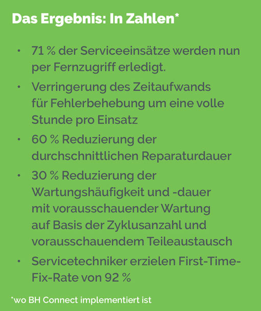 Die auf ThingWorx basierende Lösung für erweiterte Analysen – BH Analytics 360 – sammelt und analysiert Daten von vernetzten Geräten und zeigt Service-Technikern, Kunden und Managern Ergebnisse in benutzerfreundlichen Formaten an. Auf diesen vernetzten Maschinen haben Techniker nun direkten Zugang zu umfassenden Erkenntnissen, sodass sie sichere, fundierte Entscheidungen treffen können.
