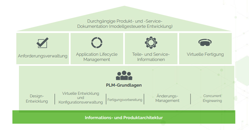 Bei der Umsetzung der Vision konzentrierte sich Volvo CE zunächst auf die Implementierung der PLM-Grundlagen – bzw. auf Teilbereiche, die auf unterschiedliche Aspekte der Produkt- und Service-Dokumentation angewendet werden würden –, die im durchgängigen PLM-Konzept identifiziert wurden. Hierzu gehörten teileorientiertes Änderungs- und Konfigurations-Management, Produktdaten-Management (mit Integration in die 3D-Multi-CAD-Umgebung), Application Lifecycle Management, Produktvariabilitäts-Management, die Verwaltung mehrerer Stücklisten (technische Entwicklungs-, Fertigungs- und Service-Stücklisten), Concurrent Engineering und mehr.
