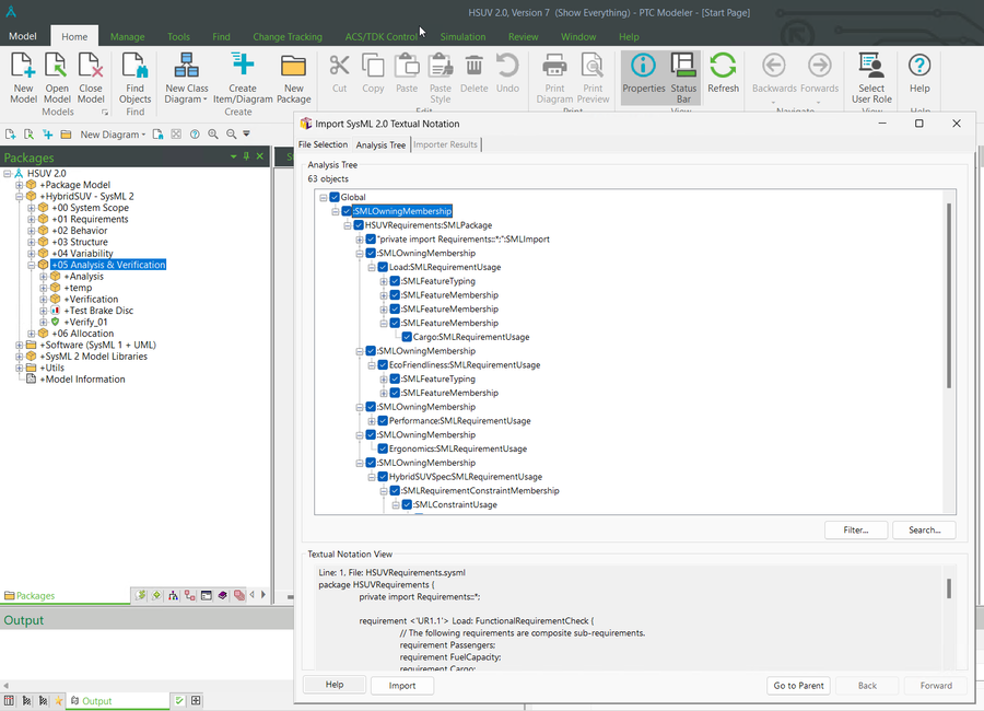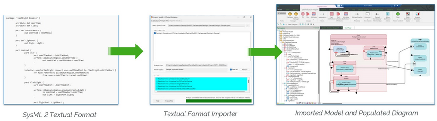 PTC Modeler 10.2 provides a way to jump-start SysML 2.0 projects by allowing you to import textual notation (.sysml files) which automatically create the equivalent model elements. This empowers your engineers to easily transition from using cumbersome, fragmented sets of files containing SysML 2.0 elements, to a model-based SysML 2 definition that’s managed in a secure SQL Server database. The easy-to-use importer tool verifies the import files for correct SysML 2 syntax, reports issues and then automatically creates all of the relevant model elements and relationships.