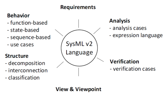 SysML 2.0 supports the modeling of system requirements, architecture, behavior, analysis/simulation and testing/verification, as shown below.