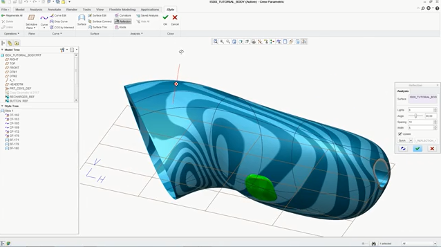 A “zebra plot” in Creo Interactive Surface Design Extension (ISDX) simulates reflection of light off a surface.