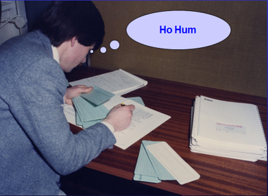 The mesh data, together with the material and physical properties, boundary conditions etc. were tabulated on data entry sheets. The computing department turned these into punch cards. A deck of cards represented an FEA input file and was fed into the mighty IBM.