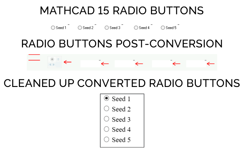 In Mathcad Prime, they appear as a single control with multiple selections. An image is created in the Mathcad Prime worksheet to indicate the position of the radio buttons in the legacy worksheet. You can delete this image if you prefer. I find it useful to delete it and adjust the appearance to the way the new functionality works.