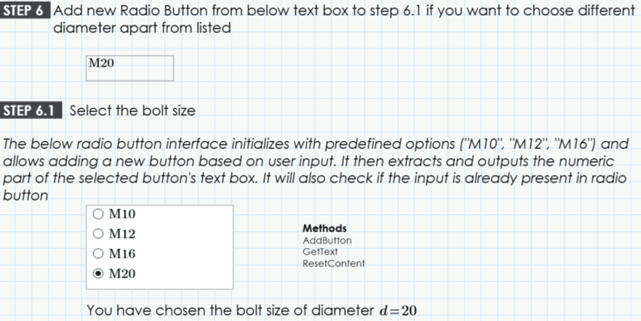 Select the bolt size. The below radio button interface initializes with predefined options ("M10", "M12", "M16") and allows adding a new button based on user input. It then extracts and outputs the numeric part of the selected button's text box. It will also check if the input is already present in radio button.
