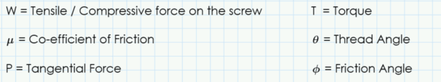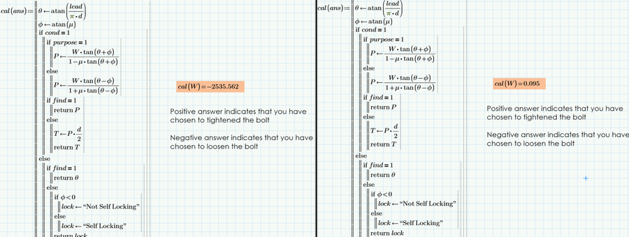 A particular problem in Statics is the solution of a threaded screw. Follow the video above to see the example in a Mathcad Prime worksheet. The basic solution process is to calculate Tangential Force, Torque, thread angle and whether thread is self-locking or not based on varying load, coefficient of friction and selecting Bolt Size: