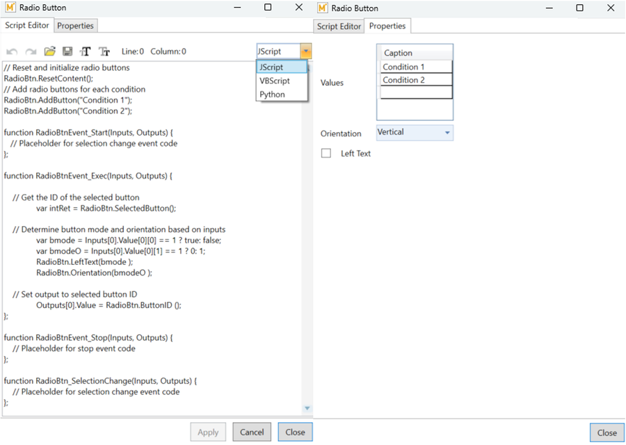Select one of the following Conditions. Based on the selection, different variables will be populated in the other radio button. The Radio Button code initializes options, updates settings based on the selected option, and sets output values accordingly.