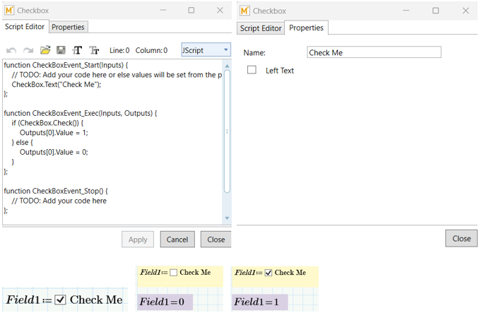 There are four events in the default script for Check Box: Start, Exec, Stop, and Click. The Exec Event is where inputs and outputs can be processed, returning the state of the Check Box.
