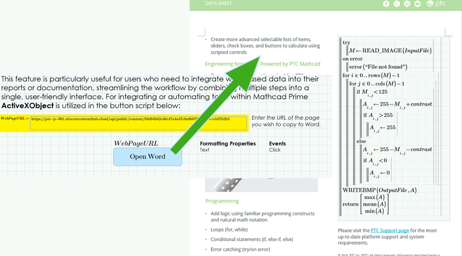 This feature is particularly useful for users who need to integrate web-based data into their reports or documentation, streamlining the workflow by combining multiple steps into a single, user-friendly interface. For integrating or automating tasks within Mathcad Prime ActiveXObject is utilized in below button script.