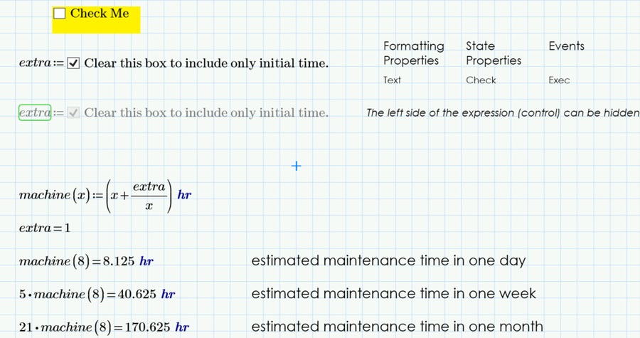 One of the Advanced Controls is the Check Box control, which returns either a 1 or a 0; on or off. Like other controls, you may insert a Checkbox from the Input/Output tab, in the Controls panel, under Advanced Controls. You can customize your Check Box through a script, its appearance can be changed through its properties, or script and additional customization can be applied from the Mathcad Formatting tab (for example yellow background, Modern 20 font).