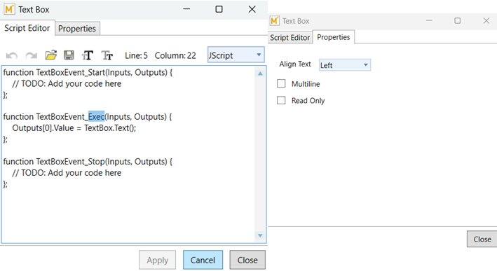 There are 3 events in the default script for Text Box: Start, Exec and Stop. All actions associated with processing user entries should be written in the Exec event.