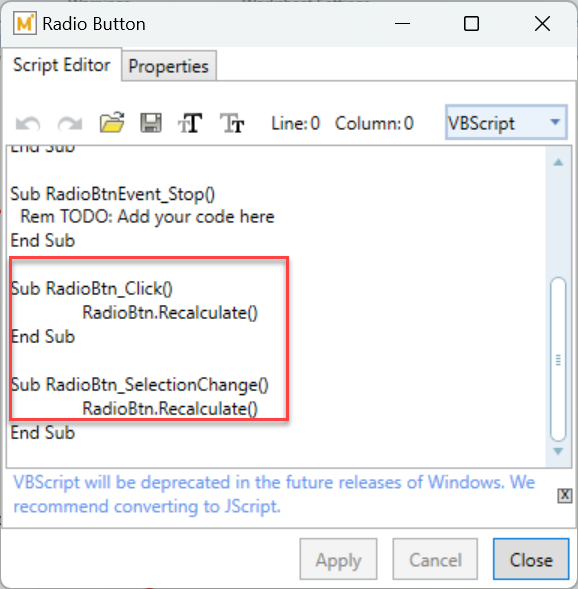 The default radio button script includes four main events: