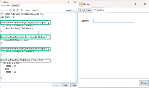 - Dual-State Appearance: While the Properties tab allows changes to a single state setting, scripting is required to program appearance effects for both states of the button. This enables dynamic visual feedback based on the button’s state.