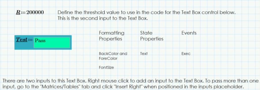The user can modify the behavior of the control on input and the resulting output through a Script in the Exec event using the Text Box Class. The appearance of a Text Box can be changed by right clicking on it and choosing “Edit” > “Properties”, and additional customization can be added from the Math Formatting tab.