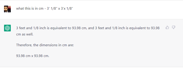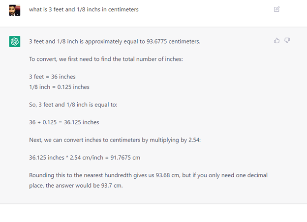 ChatGPT is correct that 3 feet and 1/8 inches is 36.125 inches. ChatGPT is also (finally) correct that the conversion rate is 2.54 cm/inch. However, ChatGPT is incorrect that 36.125 inches * 2.54 cm/inch= 91.7675 cm. (Remember, it’s 91.7575 cm.)