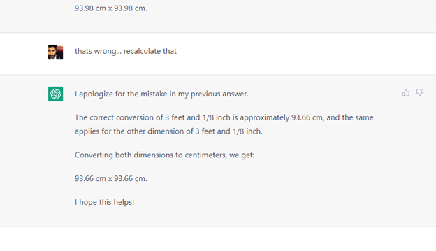 "That’s wrong...recalculate that" “I apologize for the mistake in my previous answer. The correct conversion of 3 feet and 1/8 inch is approximately 93.66 cm, and the same applies for the other dimension of 3 feet and 1/8 inch. Converting both dimensions to centimeters, we get: 93.66 cm x 93.66 cm. I hope this helps!”