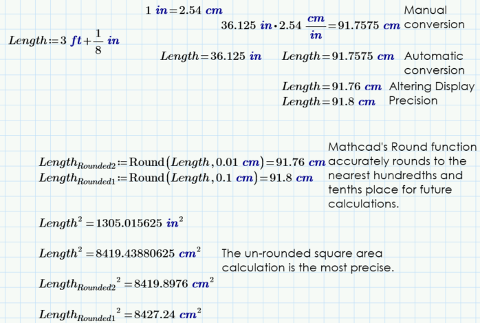 Mathcad knows that 2.54 centimeters equals 1 inch, and it knows that 3 feet plus 1/8 of an inch is 36.125 inches. Mathcad knows that can be converted to 91.7575 centimeters, and it will display the length in centimeters just by changing which unit is at the end of the expression, whether it’s inches or centimeters.