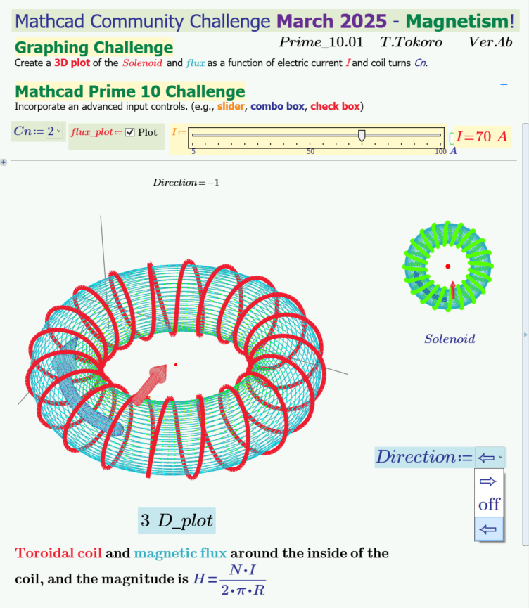 The second worksheet depicts the magnetic field in the wire from the basic challenge and magnetic flux density for the electromagnet in 3D, with slider controls. Wow. This makes for a great teaching tool for both physics and Mathcad. The third worksheet version takes on displaying a magnetic field with both an XY Plot and a 3D Plot. It has great use of color and looks very pretty. Reflecting once again the community concept, it incorporates Terry’s original work. If you’re wondering how he captures all this in a single page, he has collapsed Areas making use of the new “hide borders” functionality.