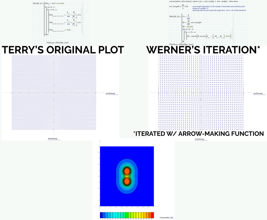 This month we had multiple submissions from frequent contributors Terry Hendicott and Professor Tokoro, with Werner E (and Professor Tokoro) building on Terry’s worksheet. Interestingly, they mostly chose to go right for the hardest challenge: plotting a magnetic field. I added this at the last minute, not expecting anyone to address it, because I had no clue how to approach the problem. Once again, the community rose to the challenge.