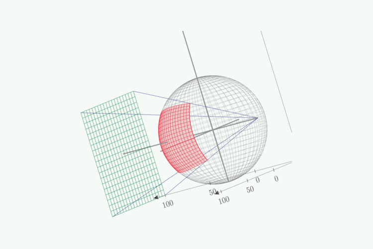 Note that the square is projected from a plane that is parallel to a plane tangent to the sphere or cylinder. It is projected in a normal direction from the tangent plane as in the accompanying images. For the sphere, the square is centered on the point of tangency for the plane to the sphere. For the cylinder, the square is centered on the middle of the cylinder and the tangent point.