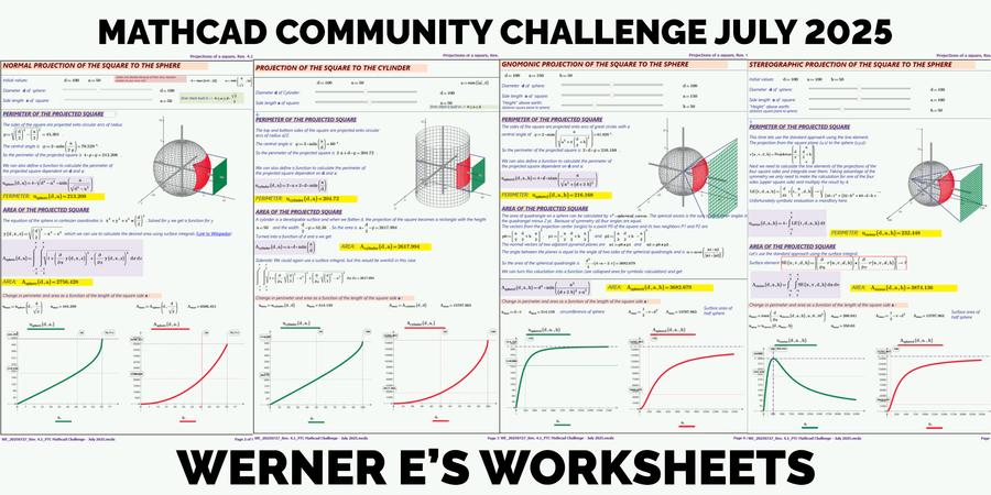 I generally shy away from declaring a “winner” in these challenges. But this month, Werner E has delivered multiple beautiful worksheets with a variety of different mathematical approaches for solving the problems. They are interactive with input controls. They are well documented with text, XY Plots, and 3D Plots. Werner’s worksheets this month are great examples of how you can use Mathcad for solving engineering and math problems. Join us in September for a programming related challenge, and check the Community Challenge archives for the write-ups of previous challenges!