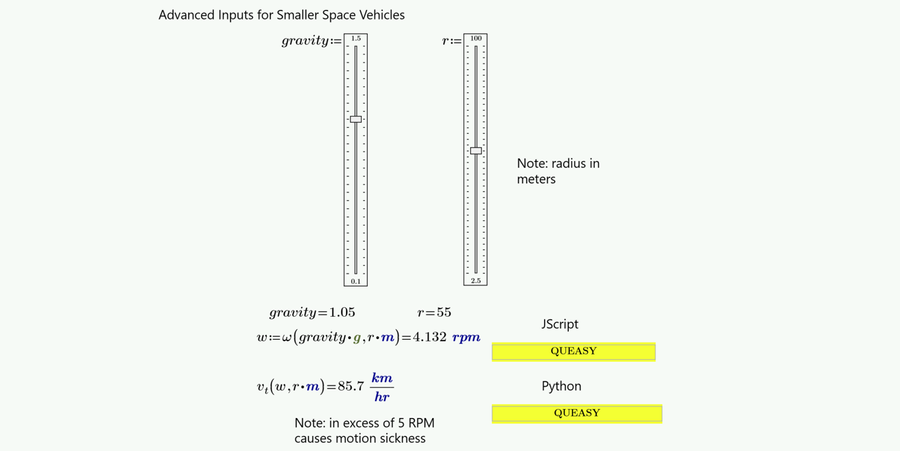 I wanted to investigate the relationships between radius of the spaceship / station and centrifugal acceleration as the independent variables, and angular velocity as the dependent variable. Rotating more than 5 RPM tends to induce nausea in people. This would be a great use of custom unit systems and scripted controls with Python in Mathcad Prime 11.