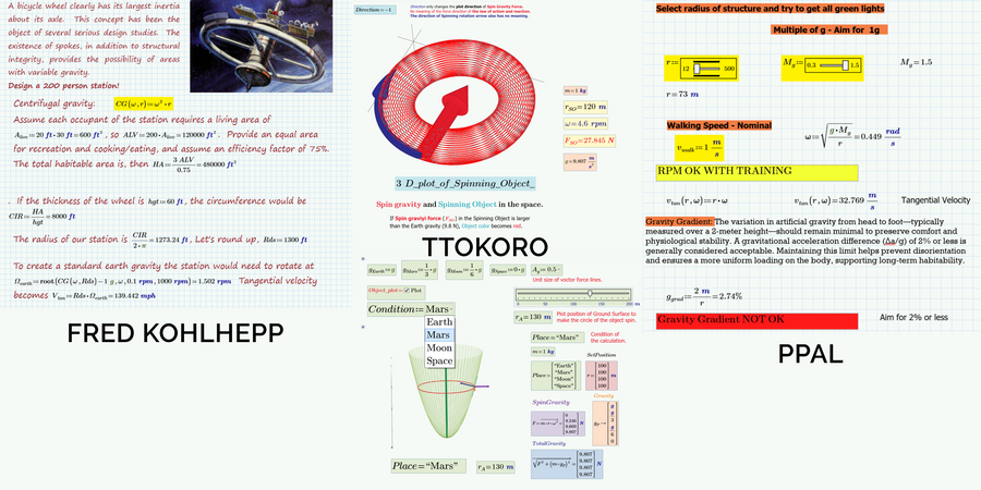 Fred Kohlhepp was the first to submit an entry. I like his worksheet because it reads like a think tank paper that both educates and provides directions towards solutions. There’s great use of text regions, images, XY plots, formatting, and math regions within text regions. The worksheet designs a space station for 200 people in a bicycle wheel design, based in inertia stability studies. For a standard 1g Earth environment, the angular velocity comes out at a comfortable 1.5 RPMs.