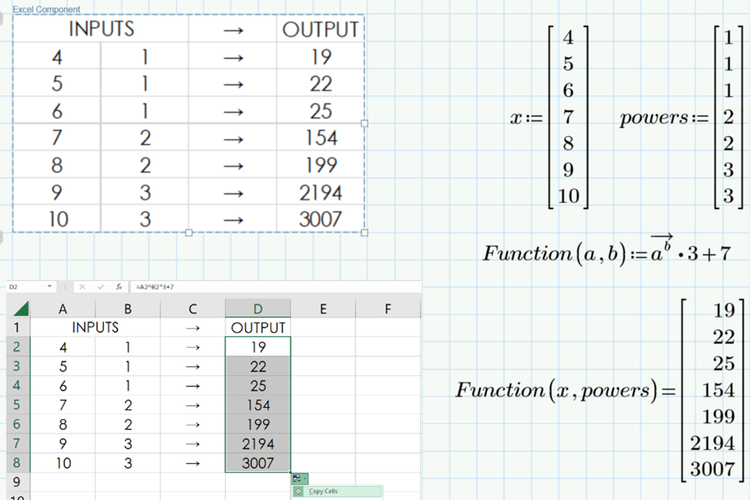 Unlike Excel's drag-and-fill method, Mathcad Prime provides a clearer and math-centric way to deal with intricate equations and vectors. By defining your function and input vectors separately, you maintain clarity and precision in your mathematical expressions.