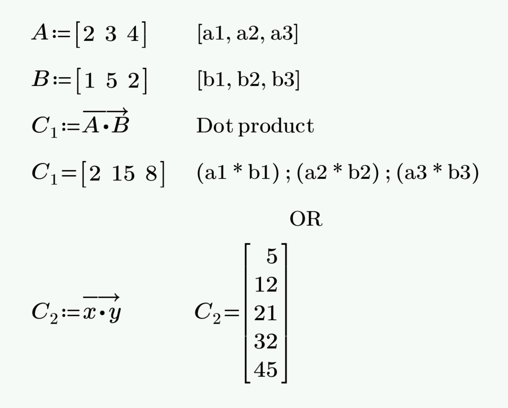 Note: Mathcad Prime will always by default do the theoretical maths for cross products and dot products.