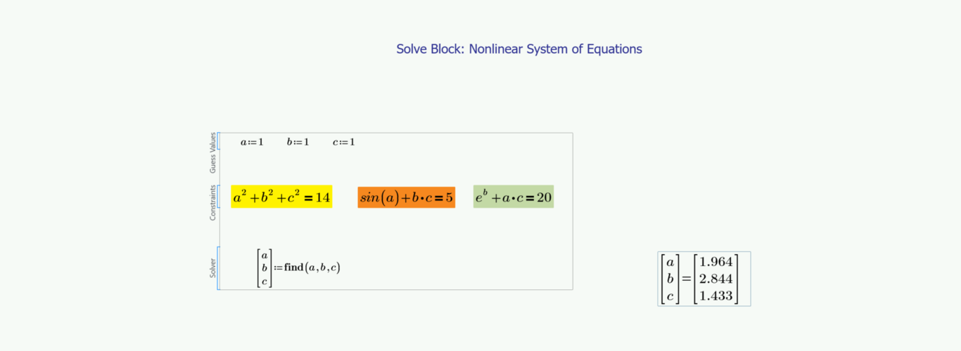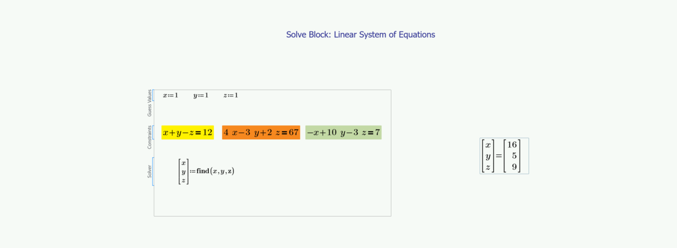 - Solver: create a vector for the variables you want to solve for. Then use the Definition operator to assign the Find function for the same variables.