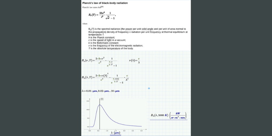 Menders also creates PowerPoint presentations for other engineering teams to help educate them on the benefits of Mathcad. He uses a photo like the one below that shows a Mathcad plot of a black-body spectrum parameterized by temperature, then lists the reasons he believes Mathcad is simply better for these kinds of tasks.