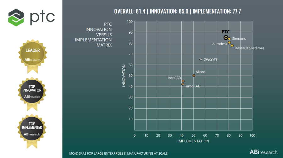 ABI’s report assessed CAD providers in two criteria categories: Innovation and Implementation. PTC received the highest scores amongst all vendors in the Innovation category.