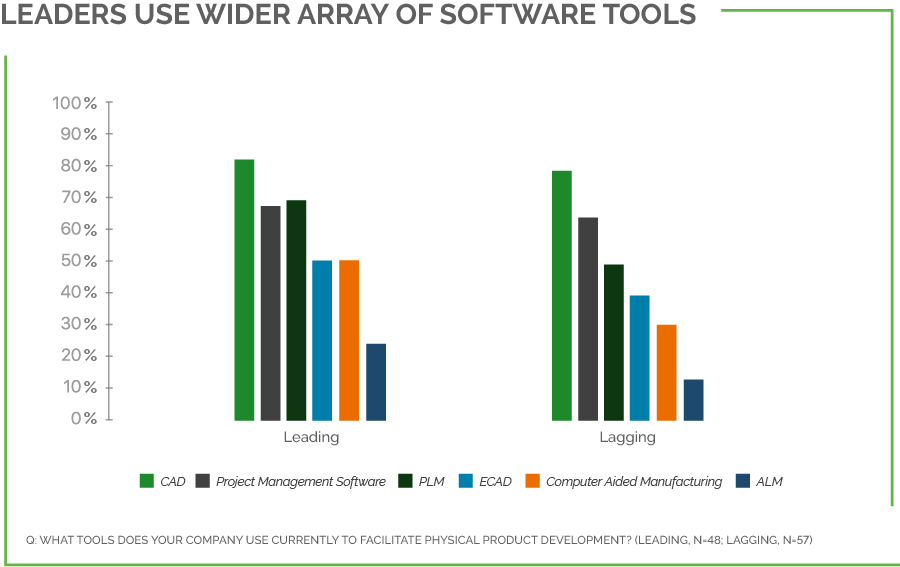 - 69% of tech leaders said they used PLM tools to facilitate physical product development vs. 49% of laggards.