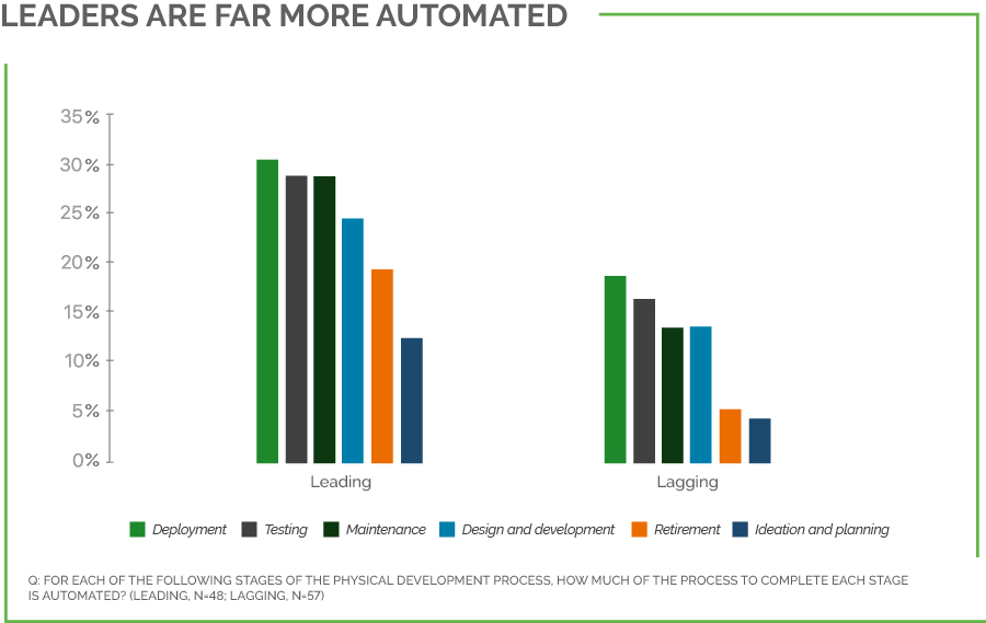 Respondents were asked to evaluate the level of automation in several essential physical product workflow processes, including deployment, testing, maintenance, design and development, retirement, and ideation and planning. As their name suggests, leaders dominated in every segment, and it wasn’t particularly close. Deployment, testing, and ideation and planning, the three most competitive categories, each saw a 13% divide between leaders and laggards regarding their automation status. Design and development was the largest area of differentiation, with leaders averaging at 25% compared to laggards’ 5%.