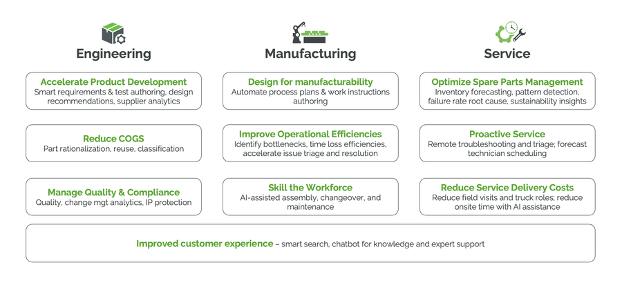 In a strategic assessment of our products, we identified top value drivers benefiting from AI. When organized across engineering, manufacturing and service several themes rose to the top, including (but not limited to) accelerated time to market, cost reductions, and workforce enablement.